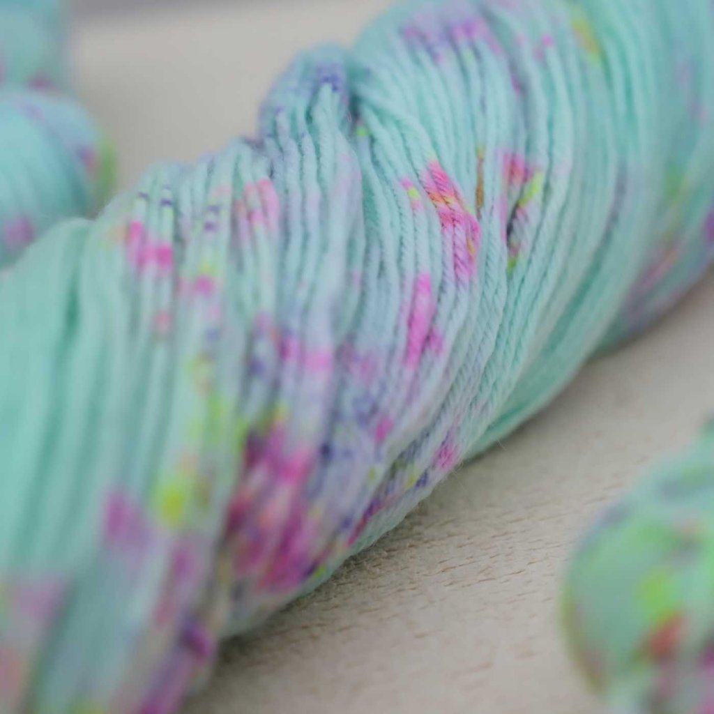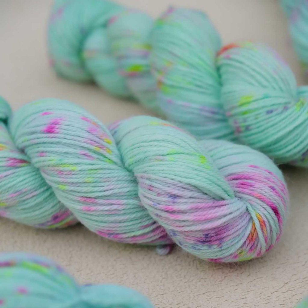 Jemná, ale přesto jedinečná tyrkysová ti vždycky zlepší den! S tímhle odstínem tě žádný mental breakdown nečeká... Nebo? Hoď na chvíli všechny starosti za hlavu a nahoď si ponožky, svetr nebo šálu. Růžové, fialové a světle zelené speckles ti rozzáří den i každý projekt.